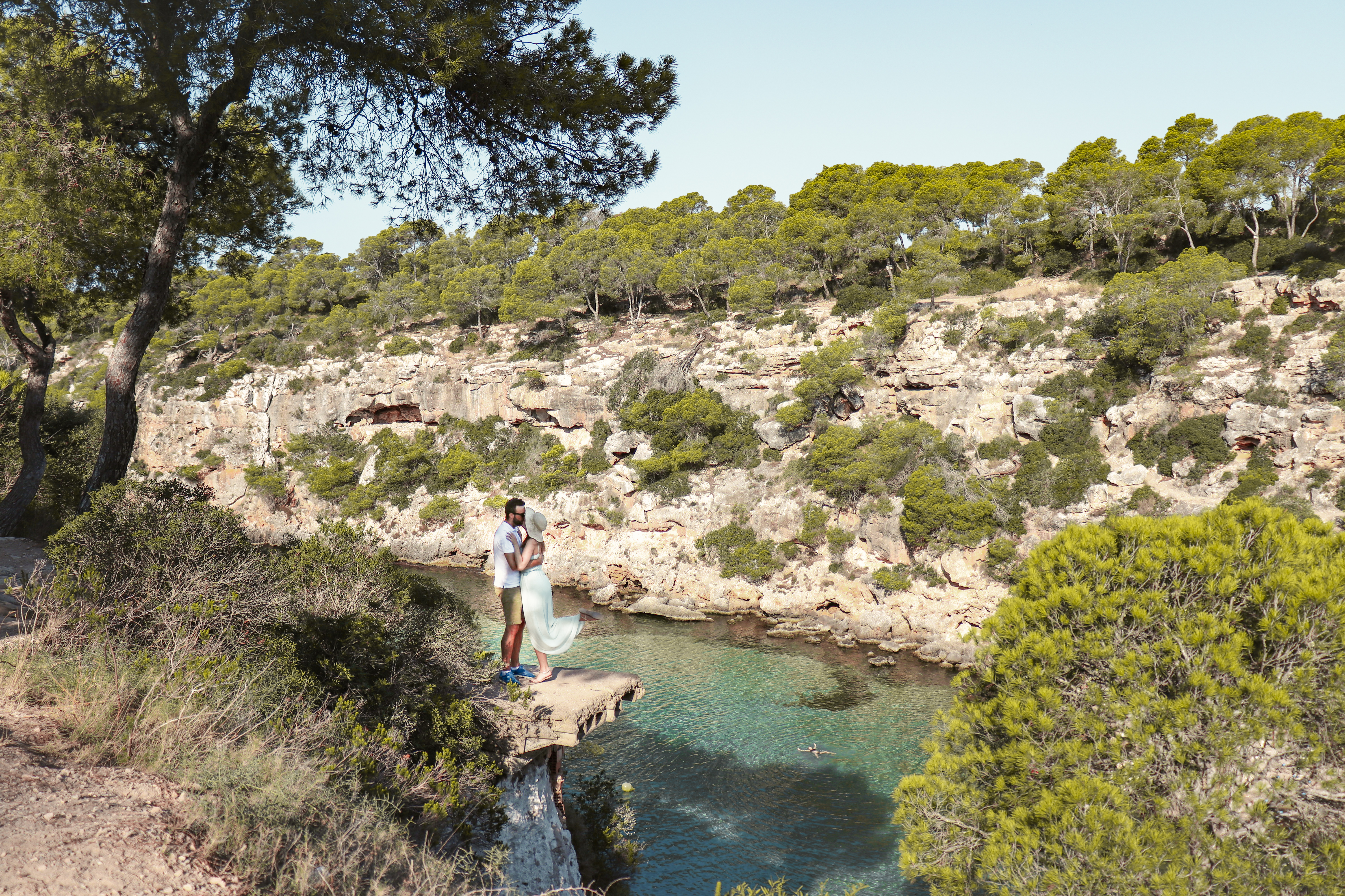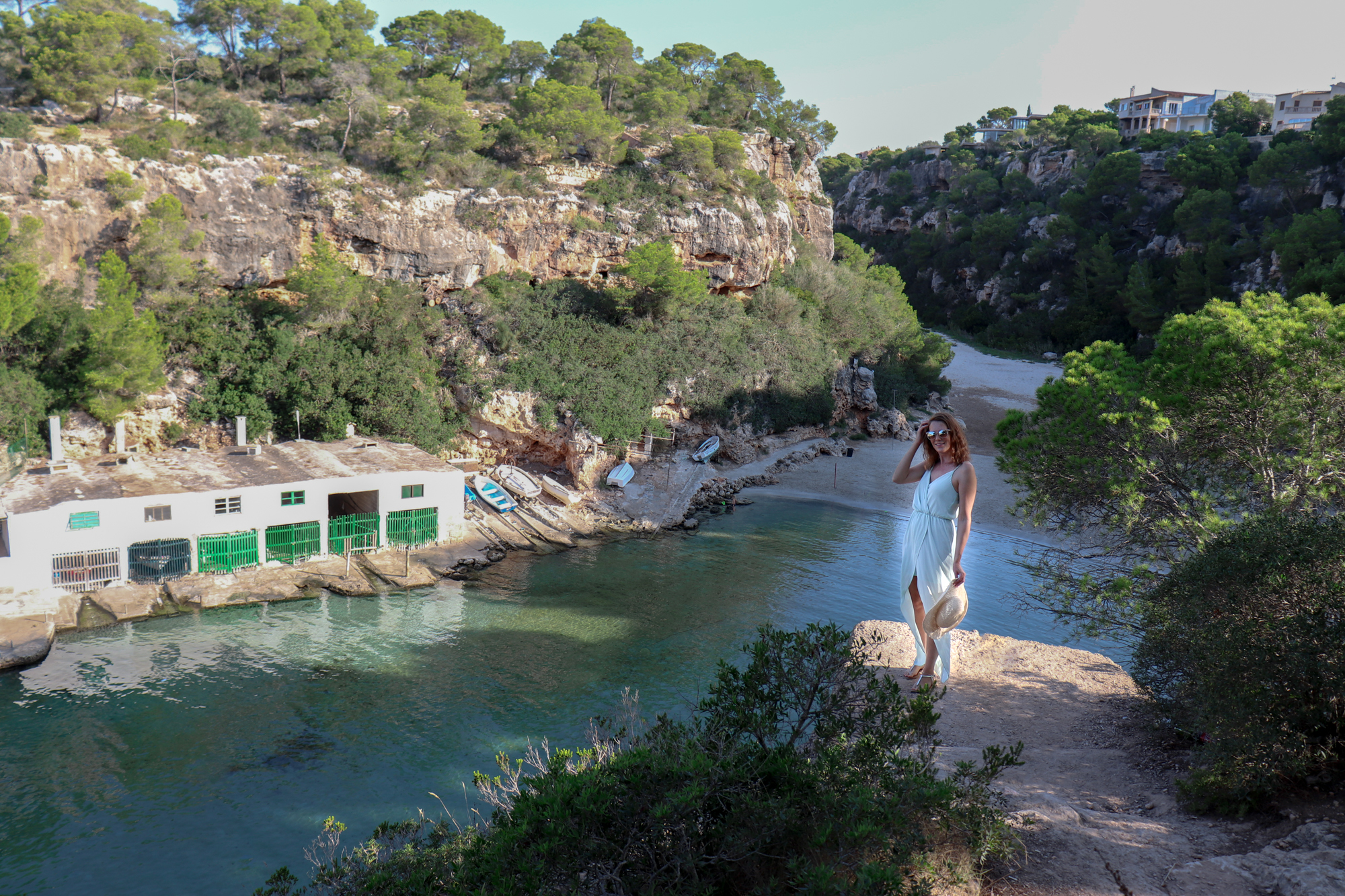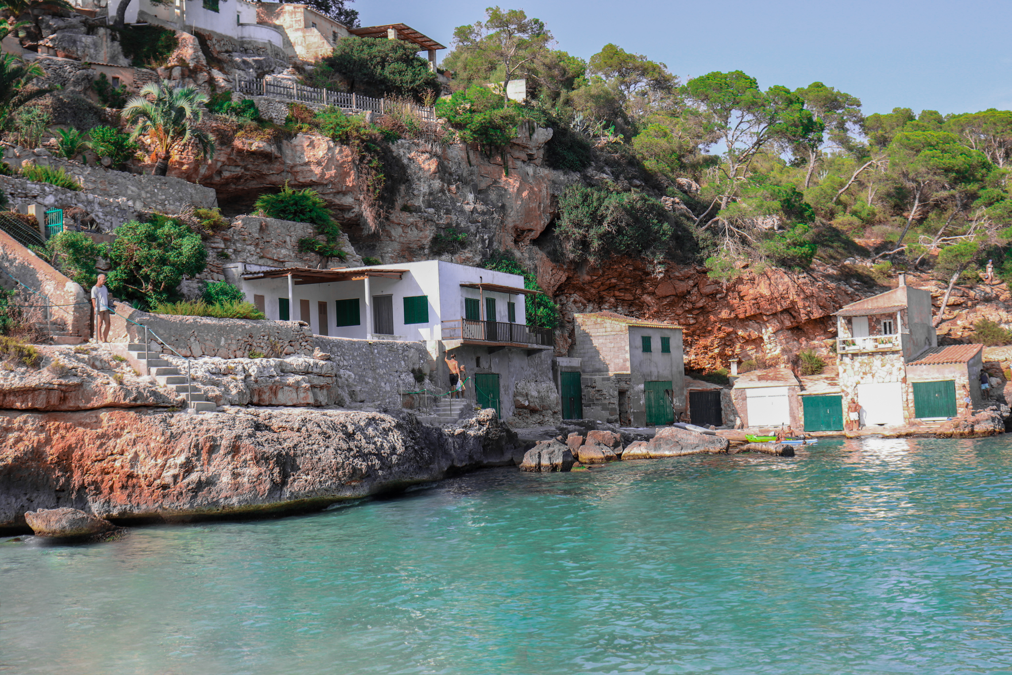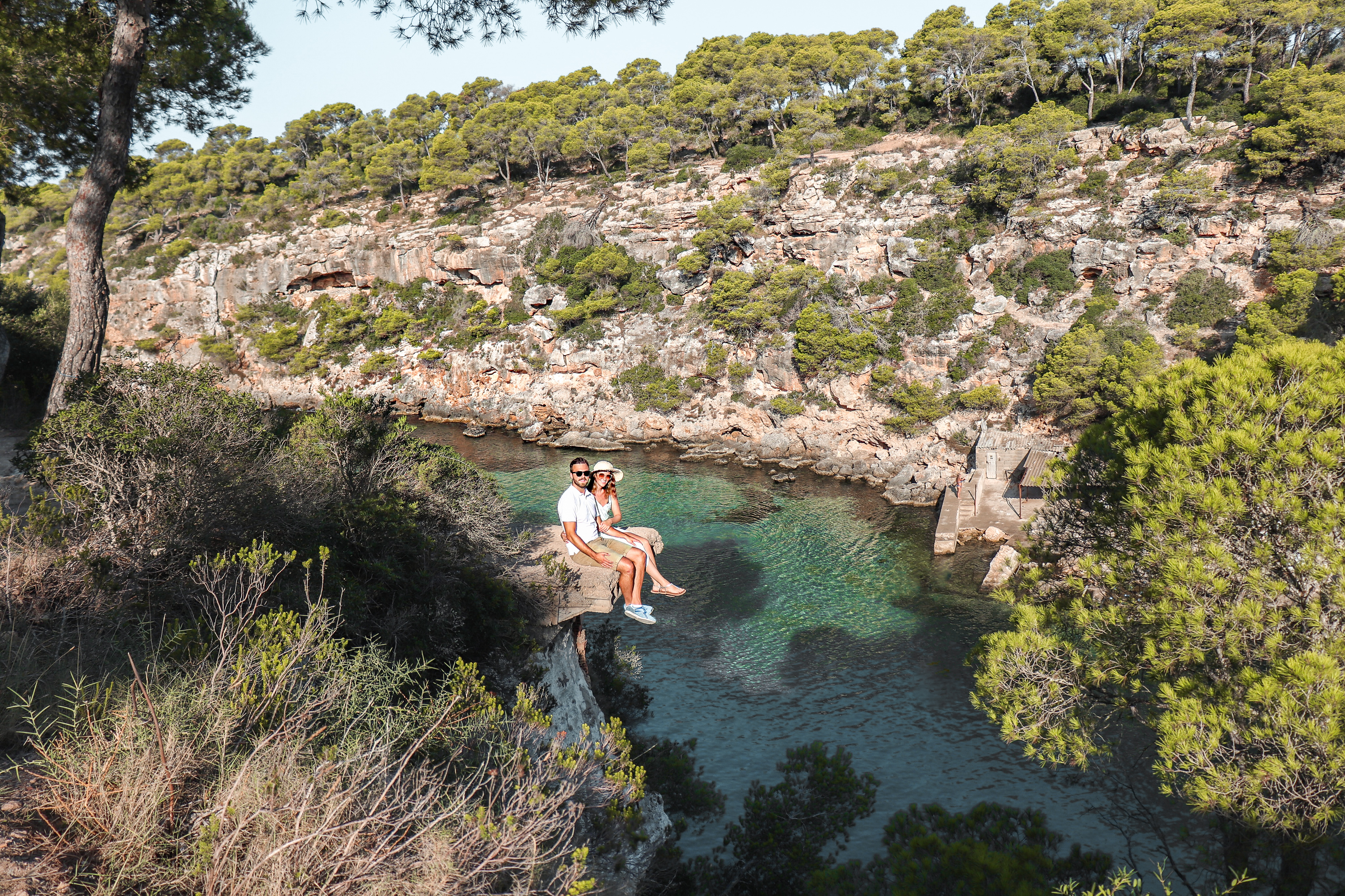 Der Strand fällt flach ins tiefe Wasser ab und die Bucht schützt weitgehend vor Wellen. Familien mit Kindern können hier also auch einen tollen Badetag verbringen. Die Cala ist umgeben von einer Felsenlandschaft, bewachsen mit Kiefern und Pinien. Auf der rechten Seite der Bucht befindet sich eine Klippe, von der ihr euch ins tiefe Wasser stürzen könnt. Auf der linken Seite ist der Hang grün bewachsen und bis auf ein paar alte Bootshäuschen ist die Umgebung der Bucht völlig unbebaut.