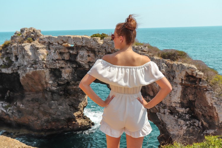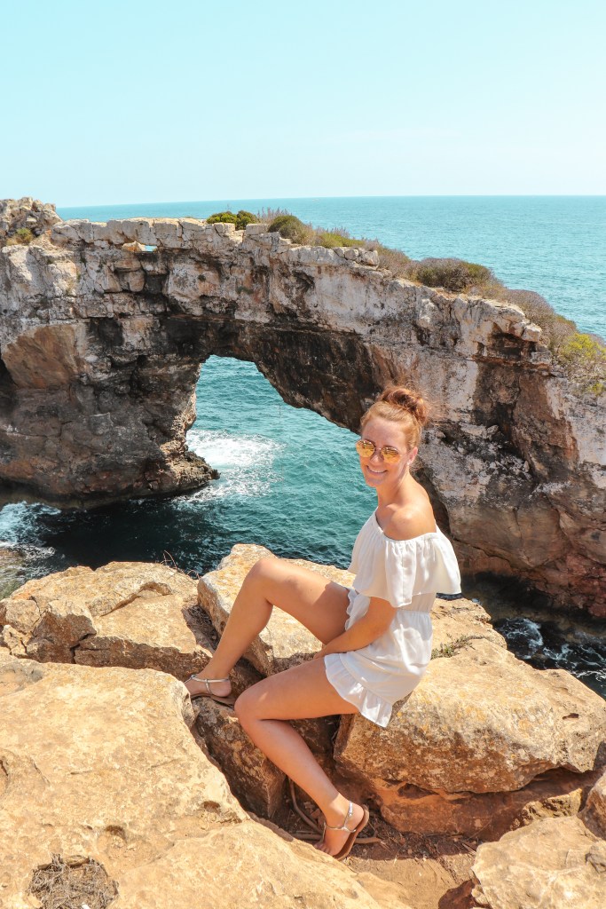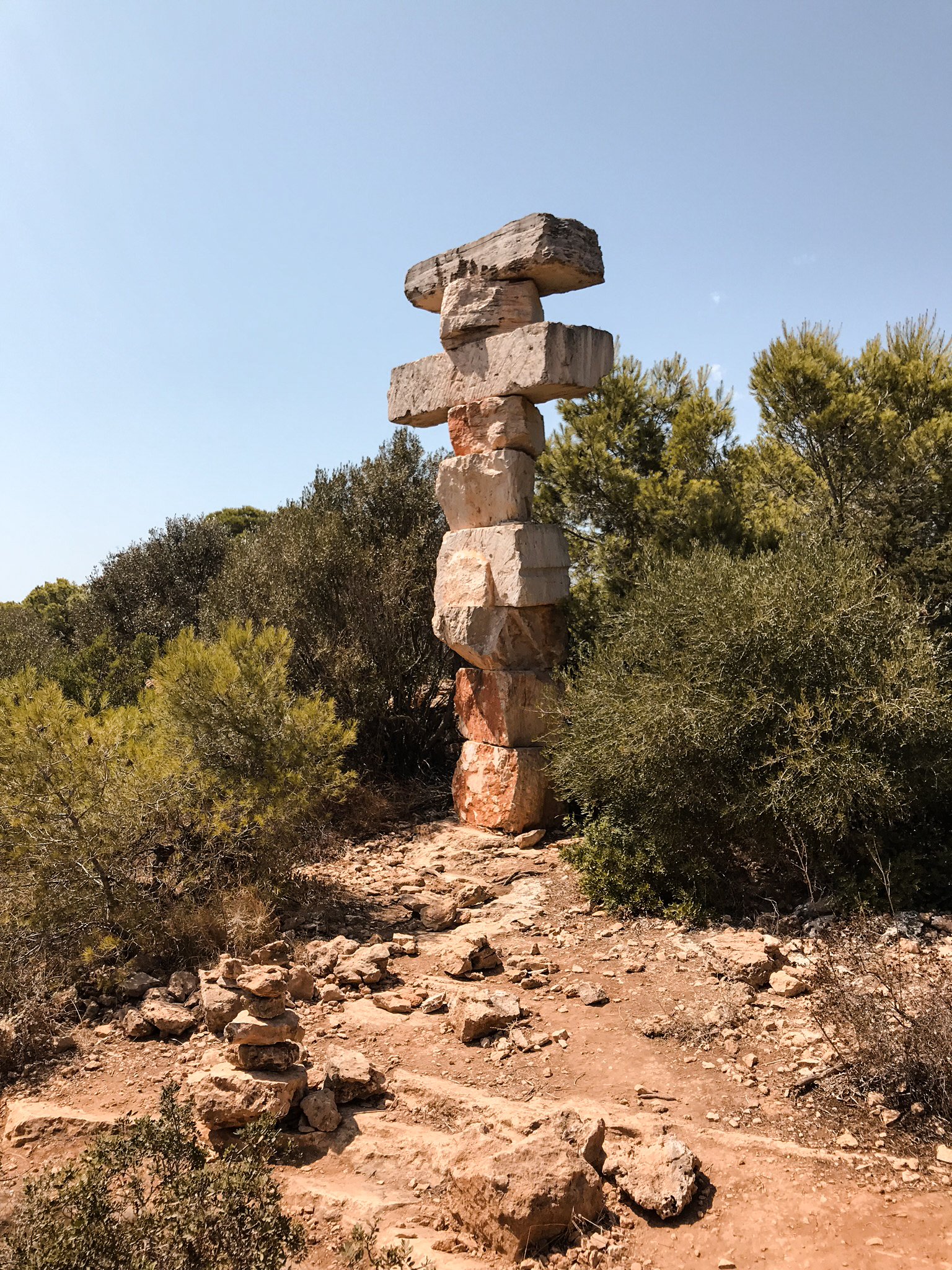 In Santanyì, direkt vor der Küste zwischen Cala Santanyí und Cala Llombards liegt das berühmte Felsentor Es Pontàs vor einer Küste im Meer. Ins Navi gebt ihr „Mirador Es Pontàs“ ein und müsstet dann in der Straße „Carrer sa Cova d’es Coloms“ landen. Der Weg zum Felsen ist ausgeschildert und es gibt ausreichend kostenlose Parkmöglichkeiten in der Straße. Ihr benötigt nur ca. 5 Minuten vom Auto bis zum Felsen. Die letzten hundert Meter des Weges könnt ihr nur über einen Trampelpfad zurücklegen, der ziemlich uneben und steinig ist. Festes Schuhwerk ist hier von Vorteil, wobei ich es auch mit Sandalen geschafft habe. Auf halber Strecke des Trampelpfads werdet ihr auf eine riesige Steinskulptur eines Künstlers stoßen.