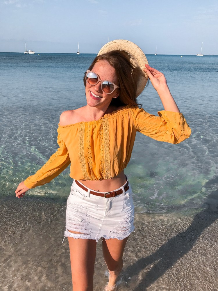 Wir waren an den ersten zwei Tagen an der Cala Agulla, deren Strand 520 m lang und 50 m breit ist. Die Bucht ist nur an der Südostseite von Hotels und Geschäften umgeben. der restliche Sandstrand ist umgeben von Dünen, auf denen sich ein dichter Kiefernwald angesiedelt hat. Das Gebiet ist ein Naturschutzgebiet. In der großen Bucht gibt es zwei Chiringuitos (Strandbars). Liegen und Sonnenschirme könnt ihr gegen eine Tagesgebühr ausleihen. Leider war der Strand überfüllt mit Touristen. Und das, obwohl in der letzten Augustwoche nur noch zwei Bundesländer in Deutschland Ferien haben. Für Partyurlauber genau der richtige Strand. Wir waren allerdings froh, als wir unser Mietauto abgeholt haben und unser eigenes Ding machen konnten, da wir viel lieber die Insel erkunden möchten. An einem Abend haben wir einen Spaziergang entlang der Cala Agulla gemacht, den Strand etwas genauer unter die Lupe genommen und uns den Sonnenuntergang angeschaut. Am Abend ist der Strand wirklich sehr schön anzuschauen, wenn der Trouble weg ist und Ruhe eingekehrt ist.