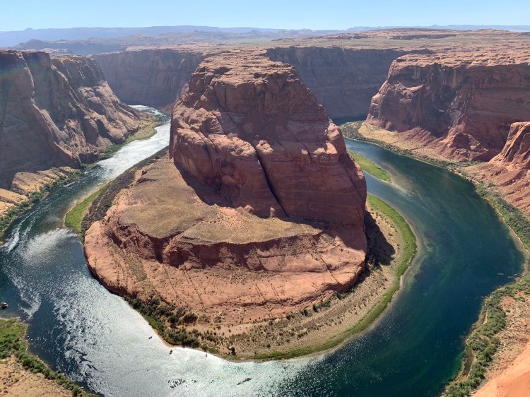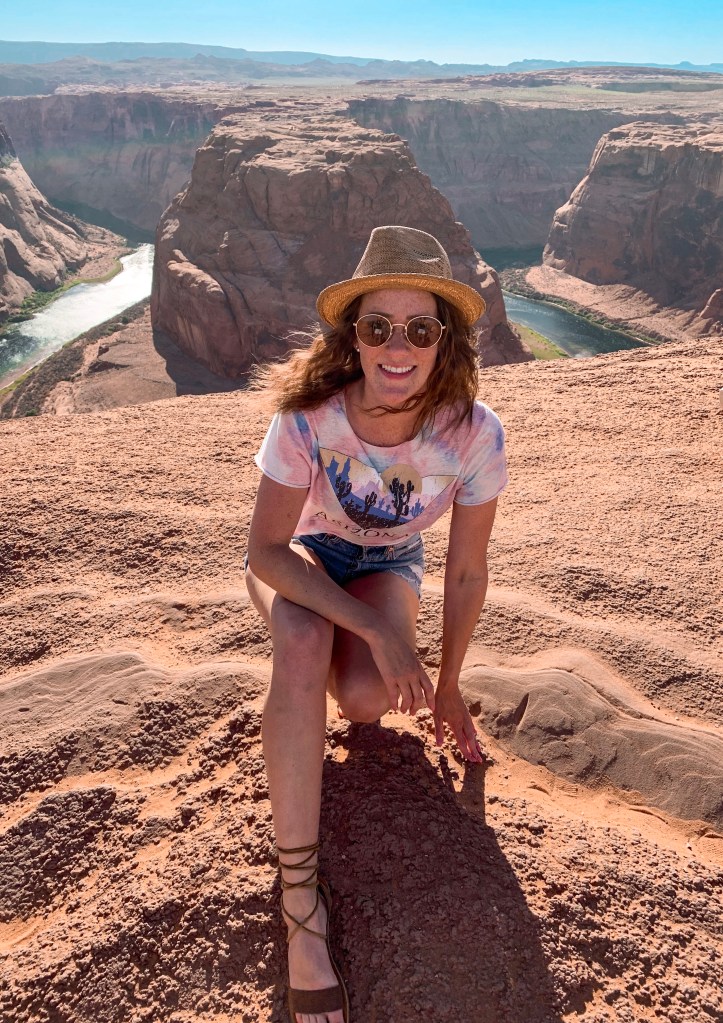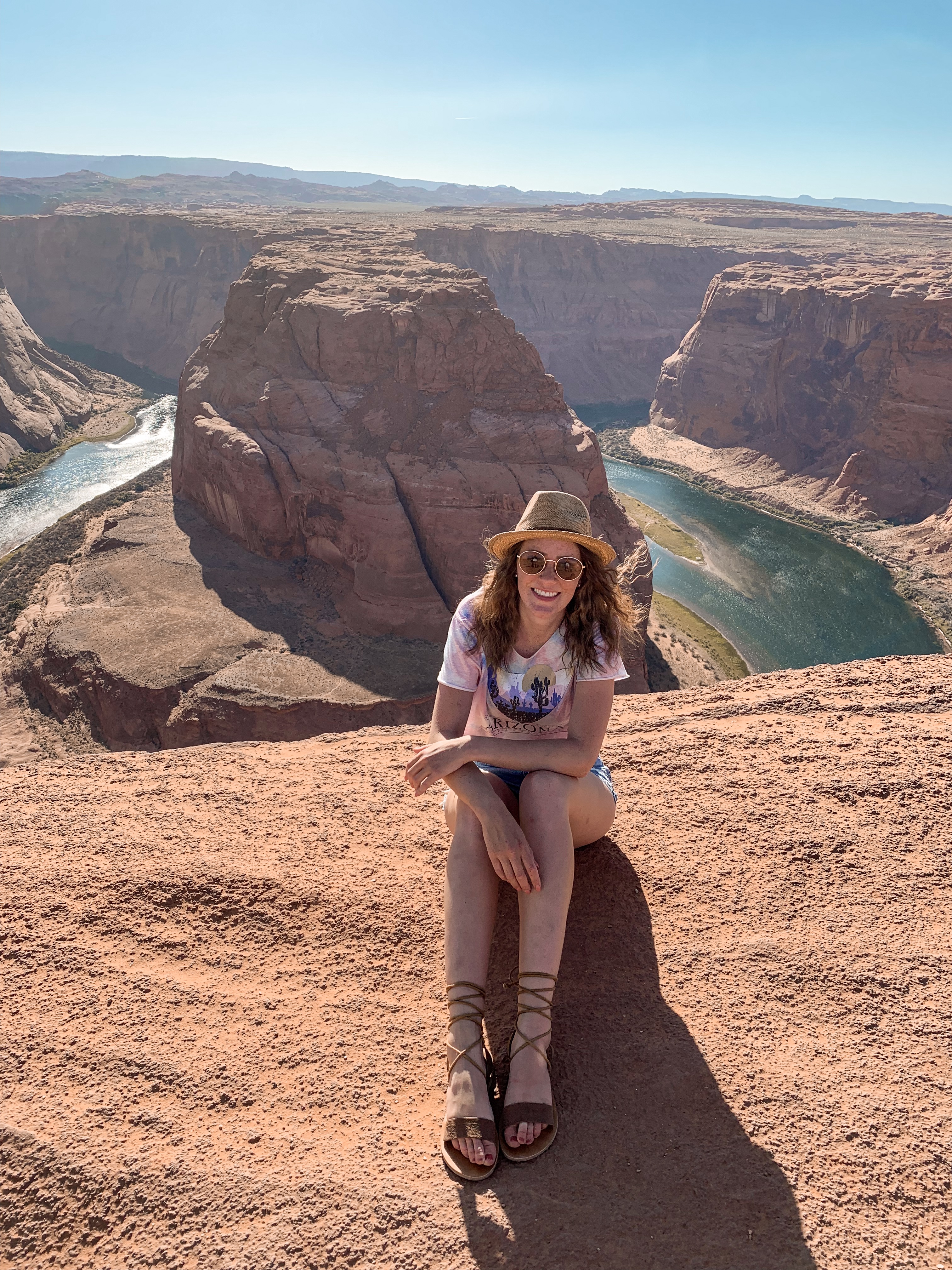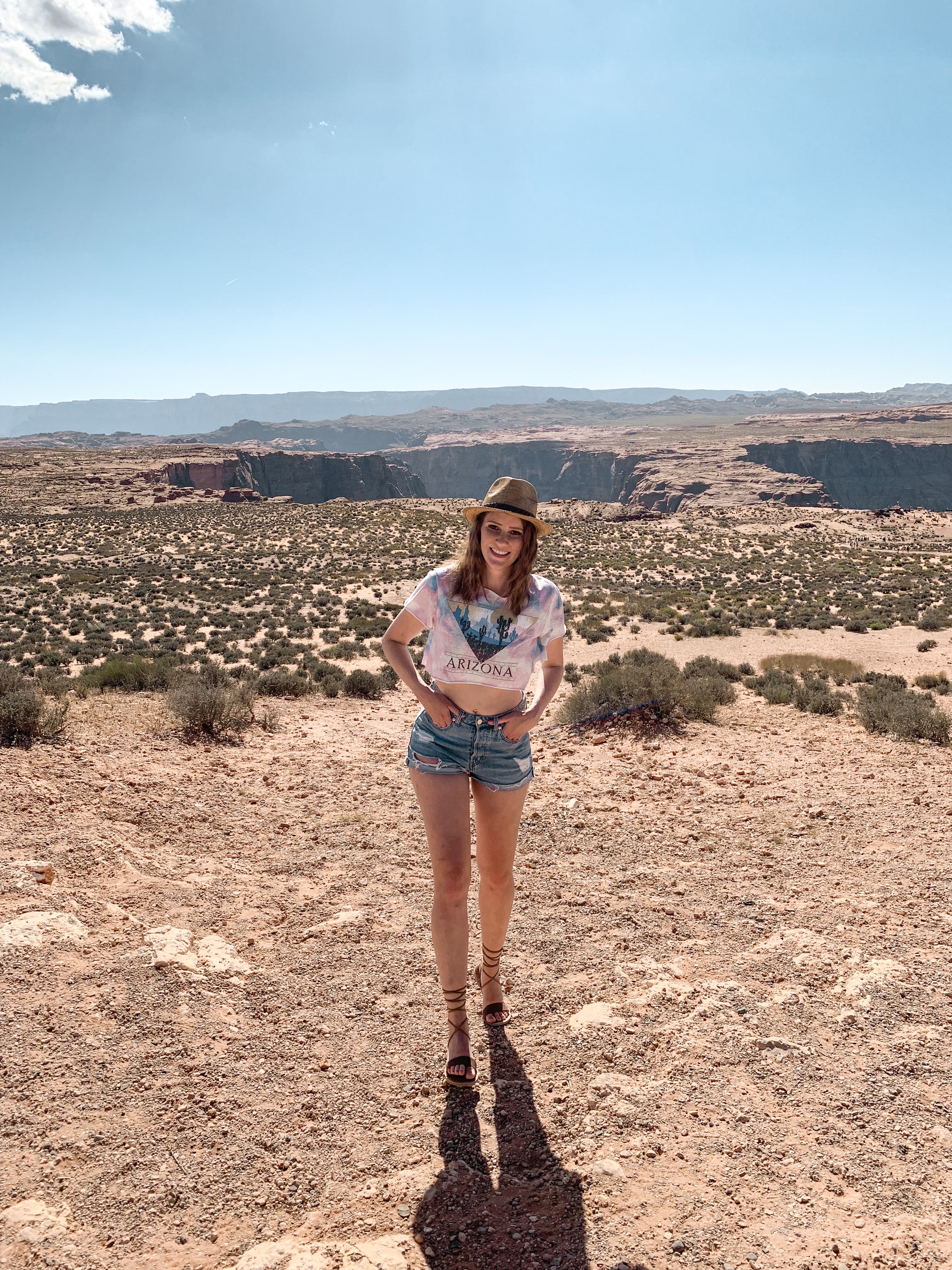 Vom Parkplatz zum Horseshoe Bend führt ein ca. 10-15 minütiger Fußweg durch die Wüstengegend. Ich empfehle euch festes Schuhwerk, da der Weg nicht befestigt ist. Hier weht zeitweise ein sehr starker Wüstenwind, der euch den Sand ins Gesicht und um die Ohren weht. Am besten setzt ihr euch eine Sonnenbrille auf, besonders für Kontaktlinsenträger ist dieser sandige Wind die Hölle. Auch zu empfehlen ist ein Tuch, dass ihr euch halb vors Gesicht bindet. Die Abbruchkante des Bends könnt ihr auf halber Strecke nur erahnen. Es sieht von weitem aus wie ein riesiges Loch in der Landschaft. Der erste Blick in den Horseshoe Bend ist wirklich gewaltig und beeindruckend.