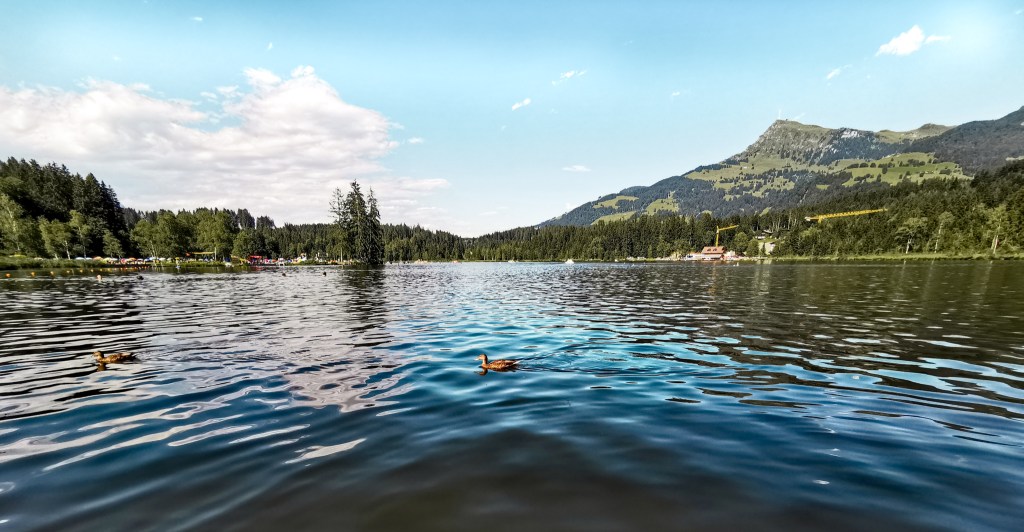 Zum Abschluss des Tages haben wir bei den hohen Temparaturen noch einen Ausflug zum Naturbadesee Schwarzsee gemacht, der nur zwei Kilometer von Kitzbühel entfernt liegt. Der Schwarzsee ist ein Moorsee und zählt zu den wärmsten und schönsten Badeseen der Alpen. Ihr könnt im Strandbad auf der Liegewiese entspannen, ein erfrischendes Bad im kühlen Nass nehmen oder euch eins der zahlreichen Tretboote ausleihen, um den Schwarzsees zu erkunden. Ein witziger Fakt: Der Sage nach hat sich der Riese Gargantua im See die Füße gewaschen und das Wasser verschmutzt – so wurde der See zum „Schwarzsee“.