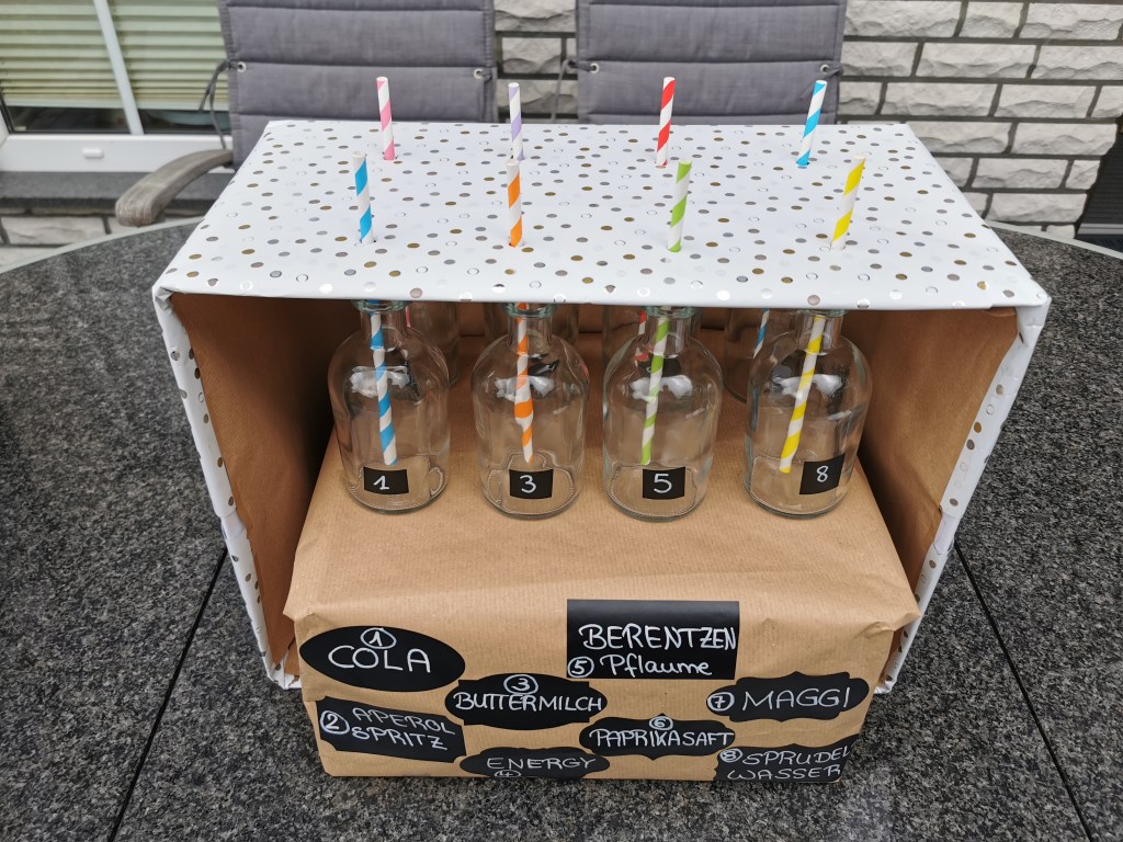 - Beschrifte die Gläser mit den Nummern und fülle die Flüssigkeiten entsprechend der Nummern in die Gläser ein. Achte darauf, die Gläser nicht zu voll zu machen, damit nicht so viel verschwendet wird (i. d. R. wird nur ein Schluck genommen).