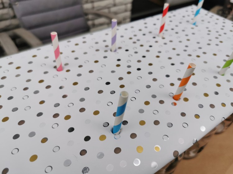 - Mit einem Stift werden kleine Löcher für die Strohhalme gemacht und zwar so, dass die Löcher ungefähr über den Gläseröffnungen positioniert sind, damit die Strohhalme durch das Loch bis in das Glas hinein reichen.