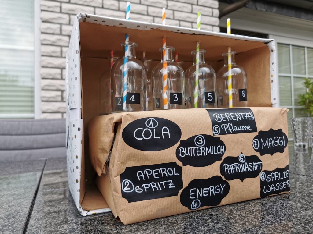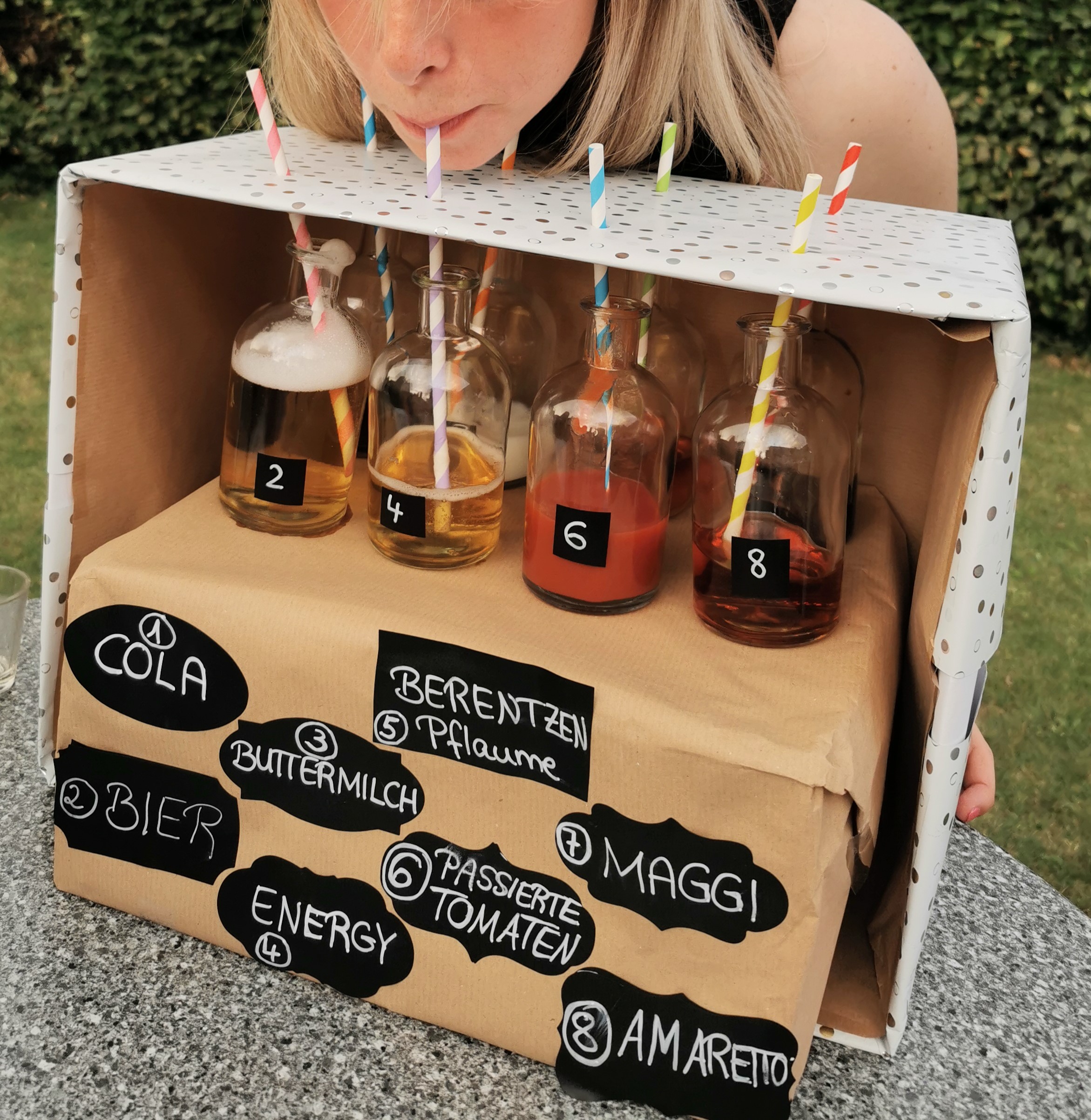 Um nichts zu verschütten, sollten die Flüssigkeiten erst kurz vor Spielbeginn vor Ort eingeschenkt werden.